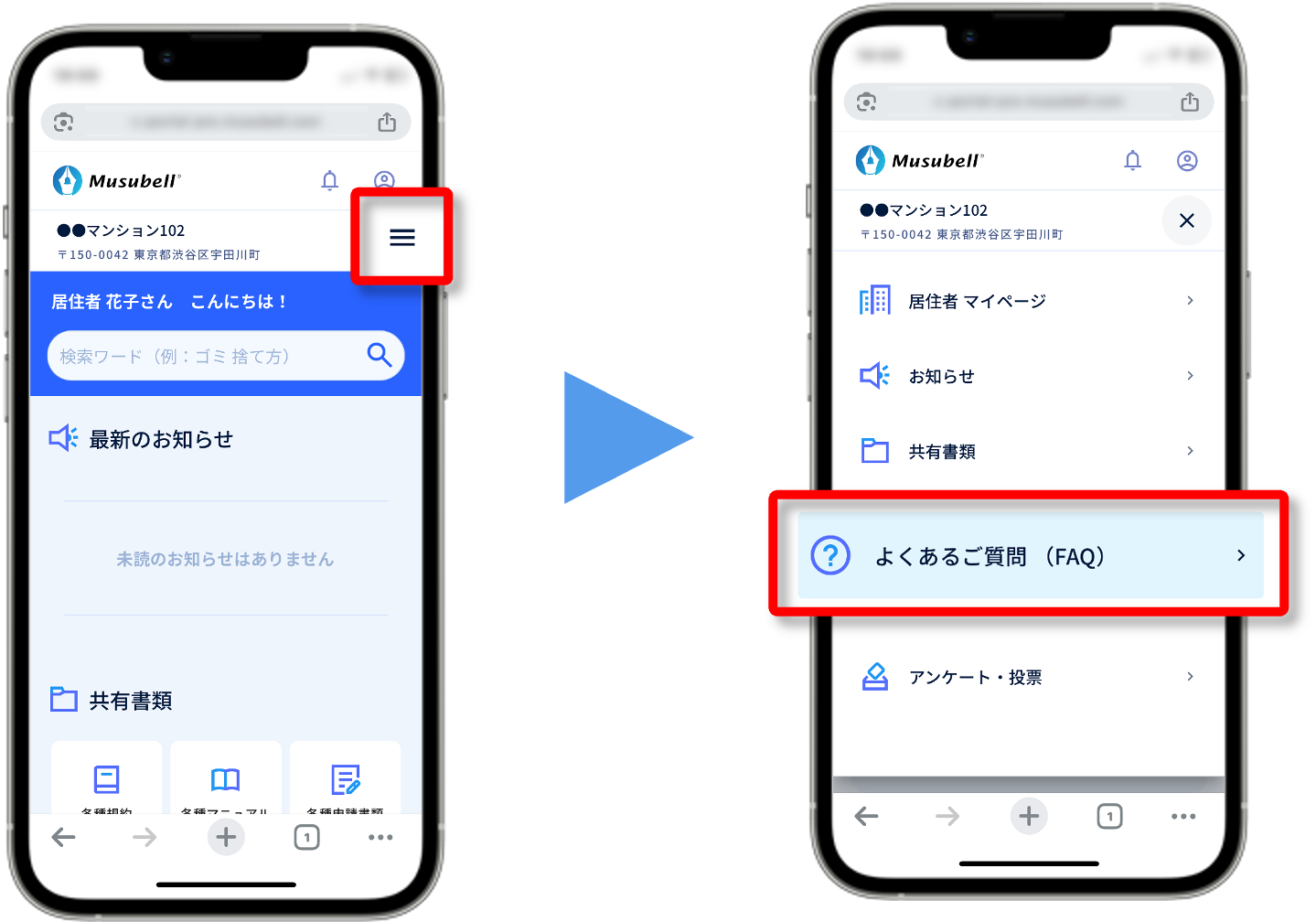 (1)マイページ右上の3本線アイコンを押して、 表示された中から[よくあるご質問(FAQ)]]を選択します。