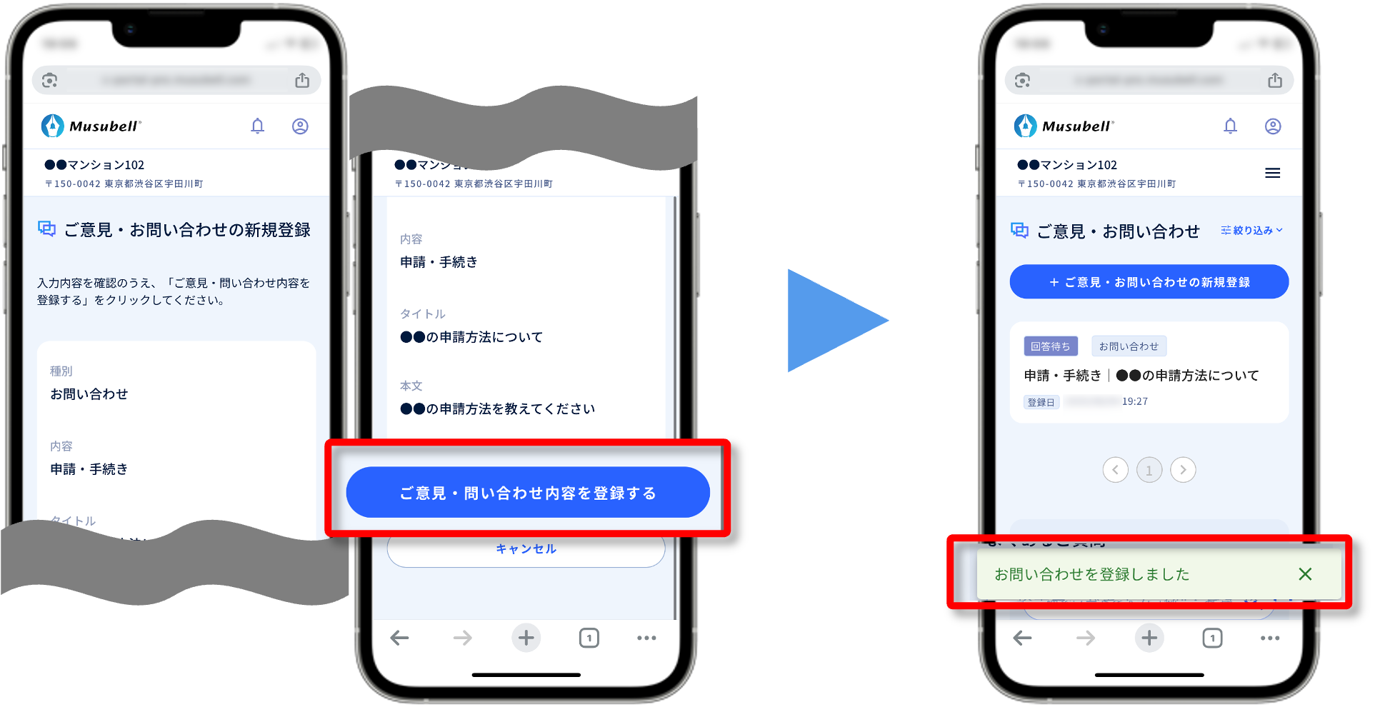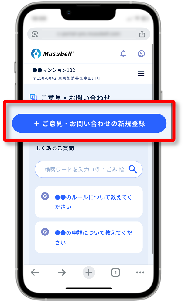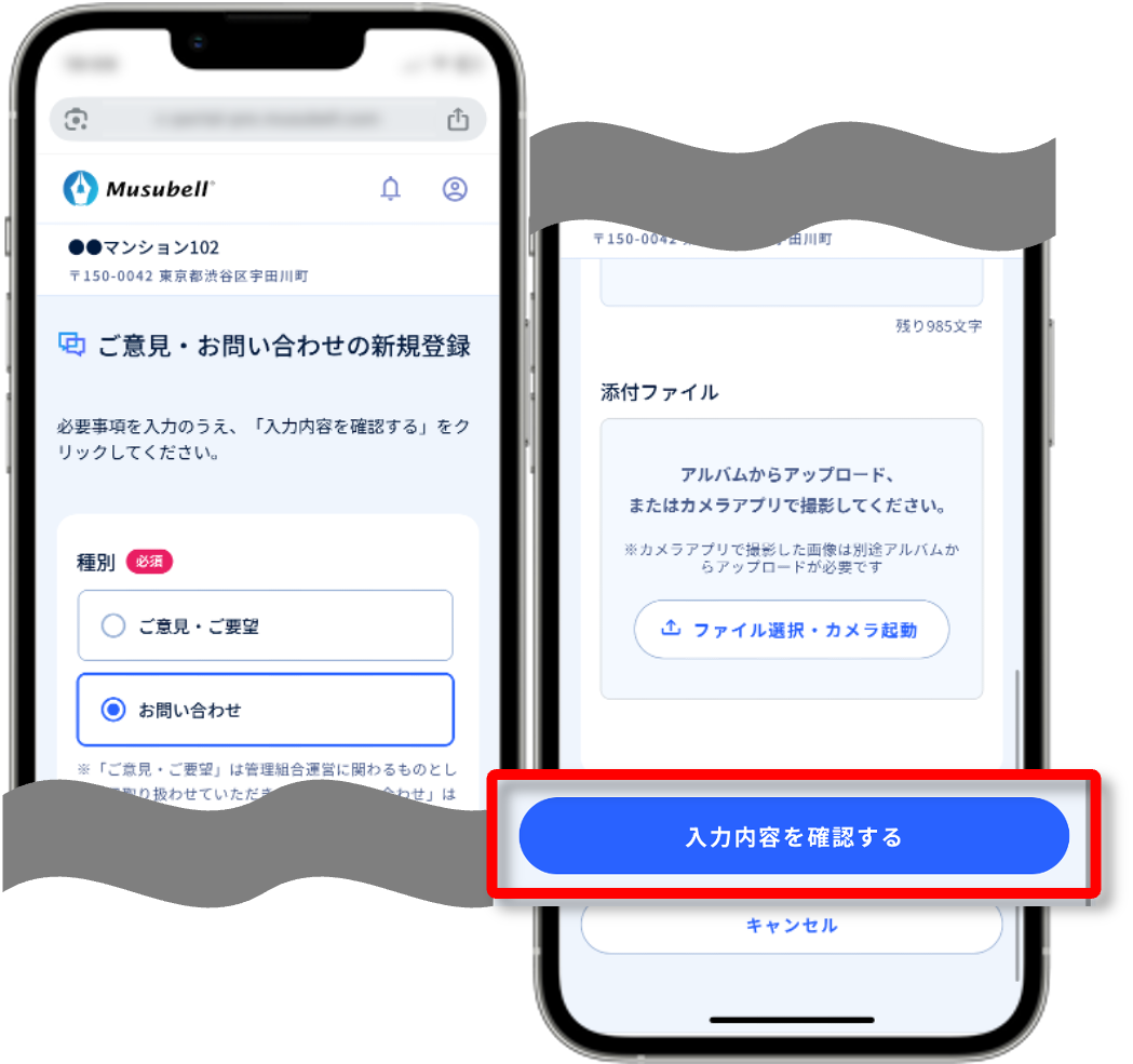 (3)ご意見・お問い合わせを登録し、[入力内容を確認する]を押します。※ご意見…管理会社が返信できない一方通行メッセージ