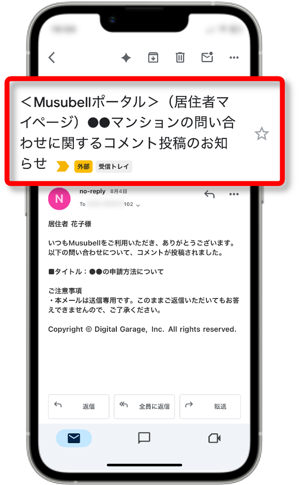 お問い合わせに対して管理会社様から返信があった際には、以下のようなメール通知が届きます。